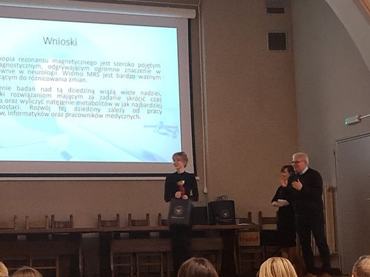 W dniu 13 stycznia na Wydziale Nauk Ścisłych i Przyrodniczych Uniwersytetu Szczecińskiego odbył się wojewódzki konkurs „Fizyka w medycynie” zorganizowany w ramach obchodów Międzynarodowego Dnia Fizyki Medycznej. Alicja Mikołajewicz z klasy 3b zdobyła w nim pierwsze miejsce. Alicja skupiła się w swojej prezentacji na zagadnieniach związanych z fizyką układu krwionośnego. Prezentacji Alicji, a także pięciu innych finalistów konkursu oraz wykładowców z Uniwersytetu Szczecińskiego wysłuchali nasi uczniowie z klasy trzeciej o profilu biologiczno- medycznym. GRATULACJE!!!