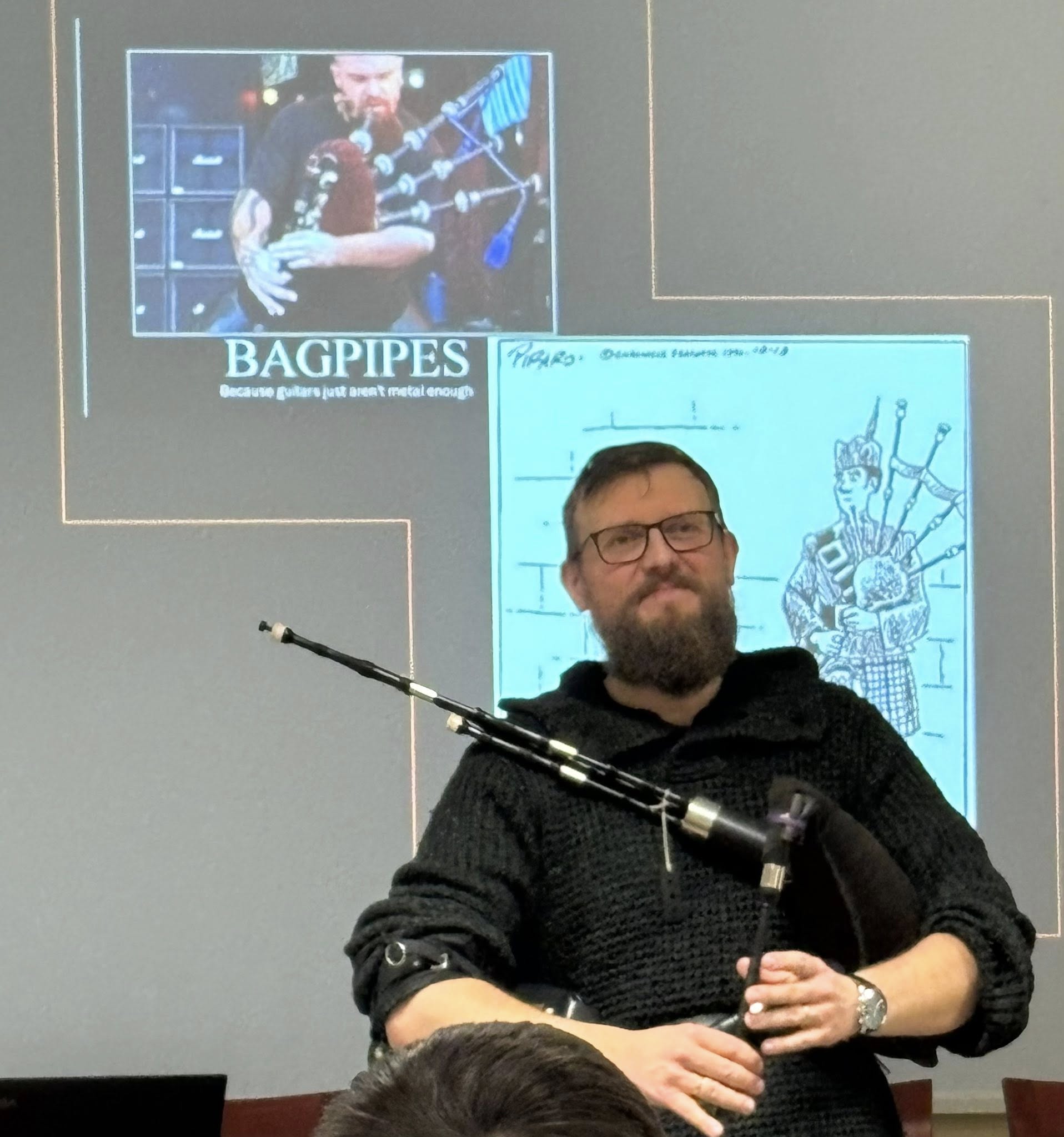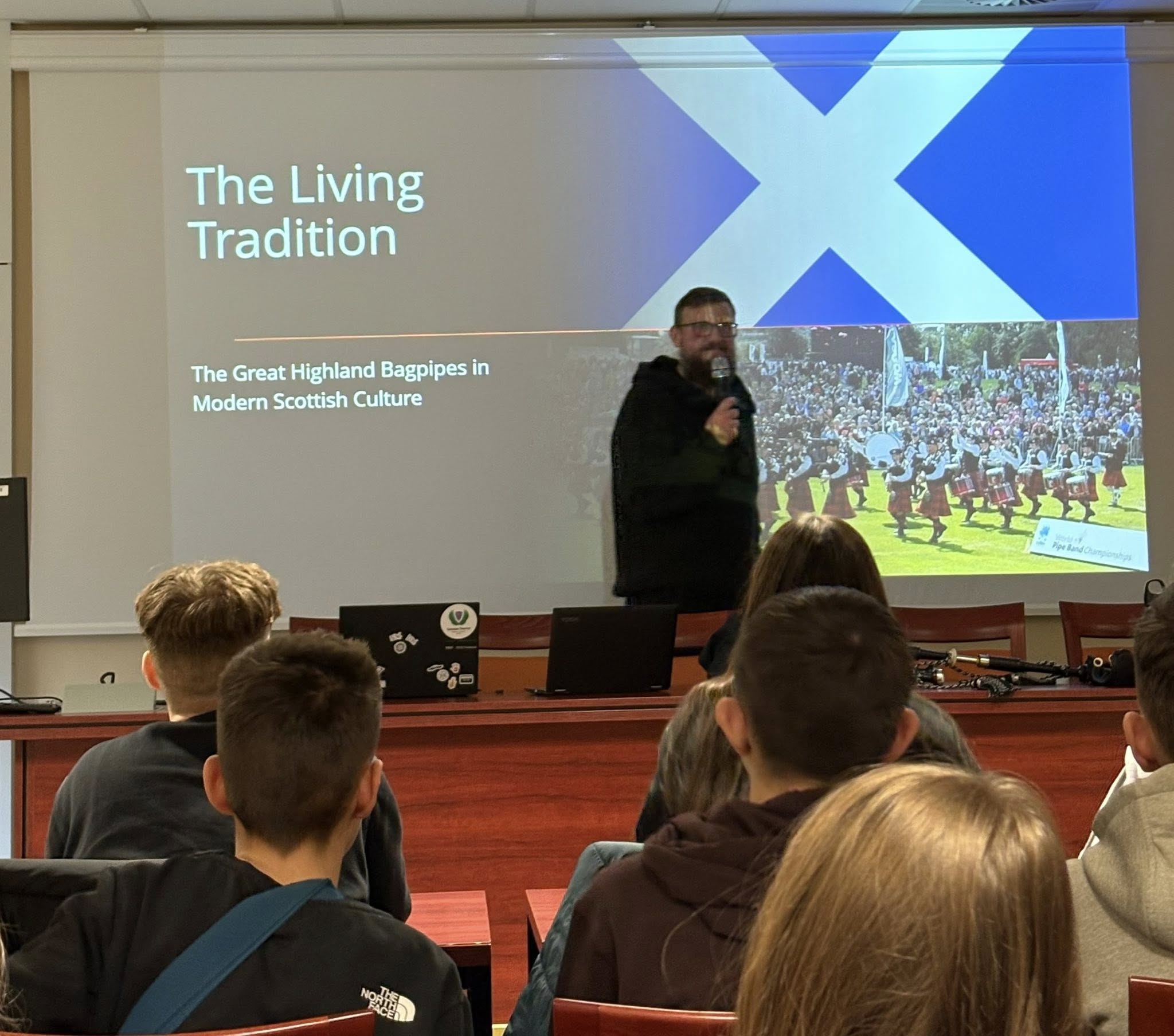 Co przychodzi Ci na myśl, kiedy słyszysz słowo Szkocja? Z pewnością jeden z najbardziej rozpoznawalnych jej symboli, czyli dudy szkockie. O ich wpływie na współczesną szkocką kulturę opowiedział pan dr Witold Konopka, który jednocześnie zaprezentował ich brzmienie. Prelekcji podczas Nocy Anglistów na Wydziale Humanistycznym Uniwersytetu Szczecińskiego wysłuchała klasa 4d realizująca rozszerzenie z języka angielskiego. Wykład wspaniale wkomponował się w tematykę szkolnych zajęć realioznawstwa, podczas których Szkocja była jednym z motywów.
